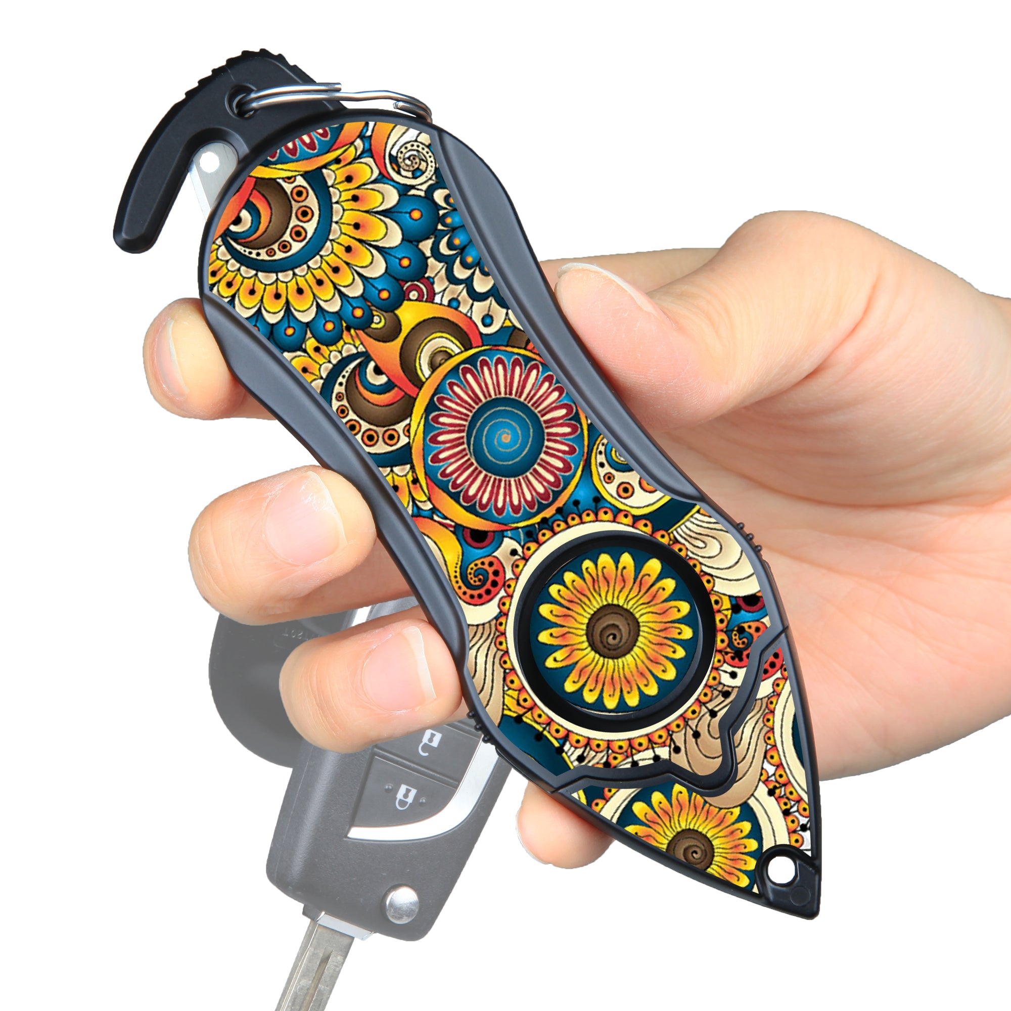 This utility knife is equipped with a glass breaker and seatbelt cutter. The window breaker seatbelt cutter quickly shatters windows cuts through car seatbelts, providing stranded people the best chance to escape a vehicle