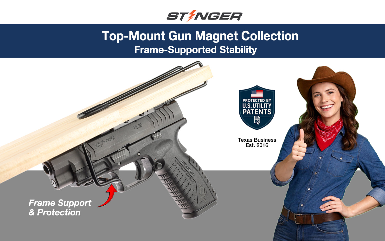 The Stinger Top-Mount Gun Magnet Collection features our latest magnetic mounting designs engineered for enhanced stability, protection, and flexible installation. Built around Stinger’s frame support and protection system, products in this collection go beyond traditional flat gun magnets by adding mechanical support that helps hold firearms securely in position—especially on upright or angled surfaces.
